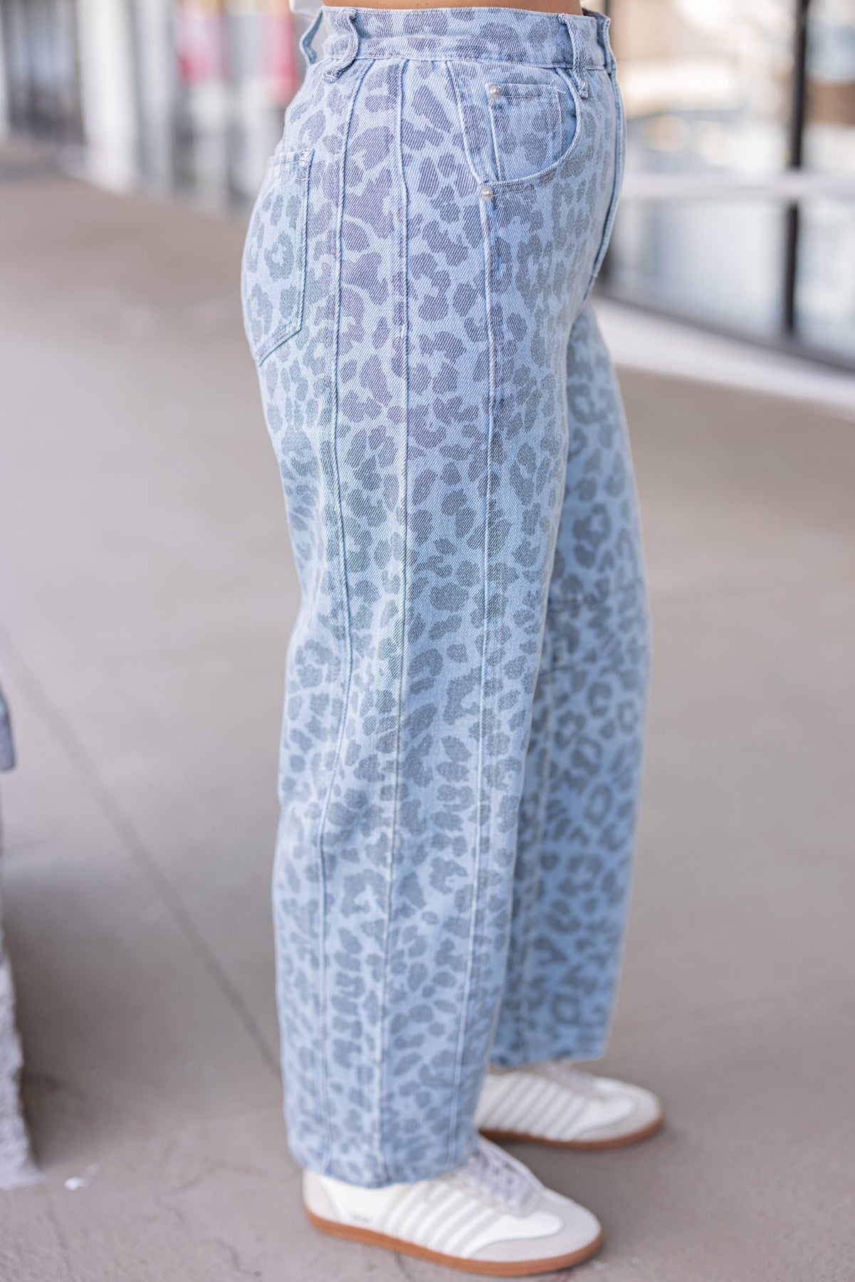 Unleash your wild side with these Blue Leopard Print Barrel Jeans. Made with washed blue and black leopard print denim, these barrel jeans feature a five pocket design for ultimate style. Stand out from the pack in these fierce and playful jeans! Shop the look: White Top | Sneakers