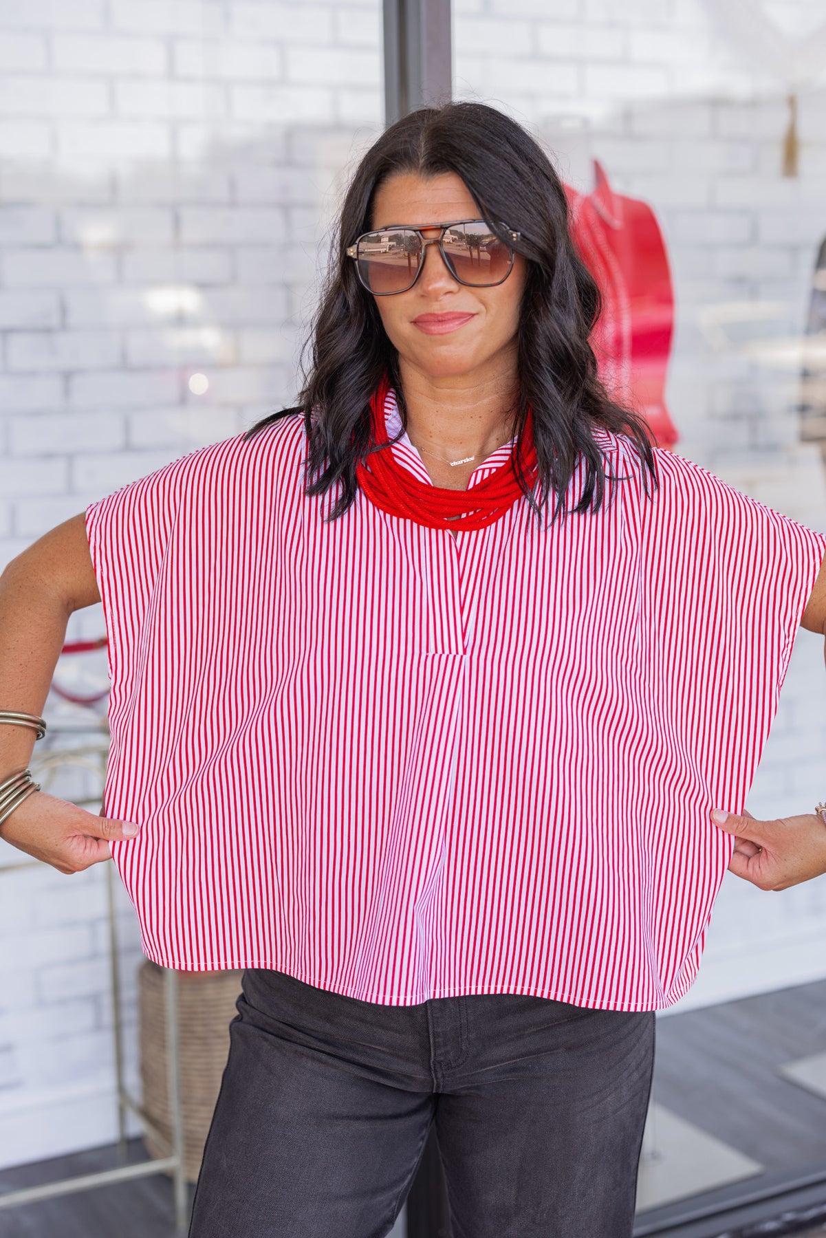 The Karlie Red Signature Stripe Collar Top features a striking red and white stripe pattern that adds vibrant charm to your wardrobe. Its flattering V cut neckline with a collar creates a polished look, while the dolman short sleeves offer both comfort and a trendy silhouette. Perfect for casual outings or upscale casual events, this top combines style and ease effortlessly!