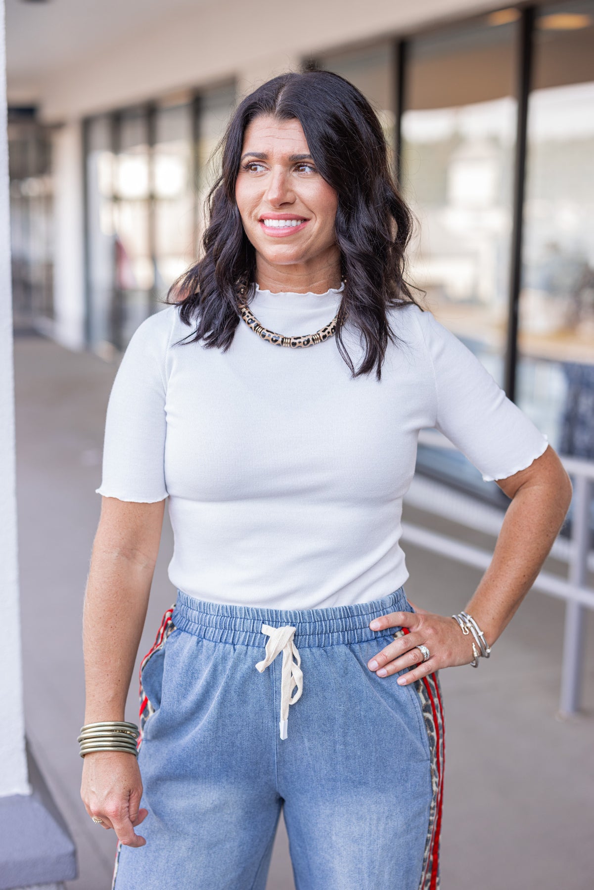 The sweetest elevated basic top! Ivory ribbed fabric with mock neck, short sleeves, and lettuce trim throughout. Perfect on her own, or layered with your fave outfits. Such a cute closet staple!