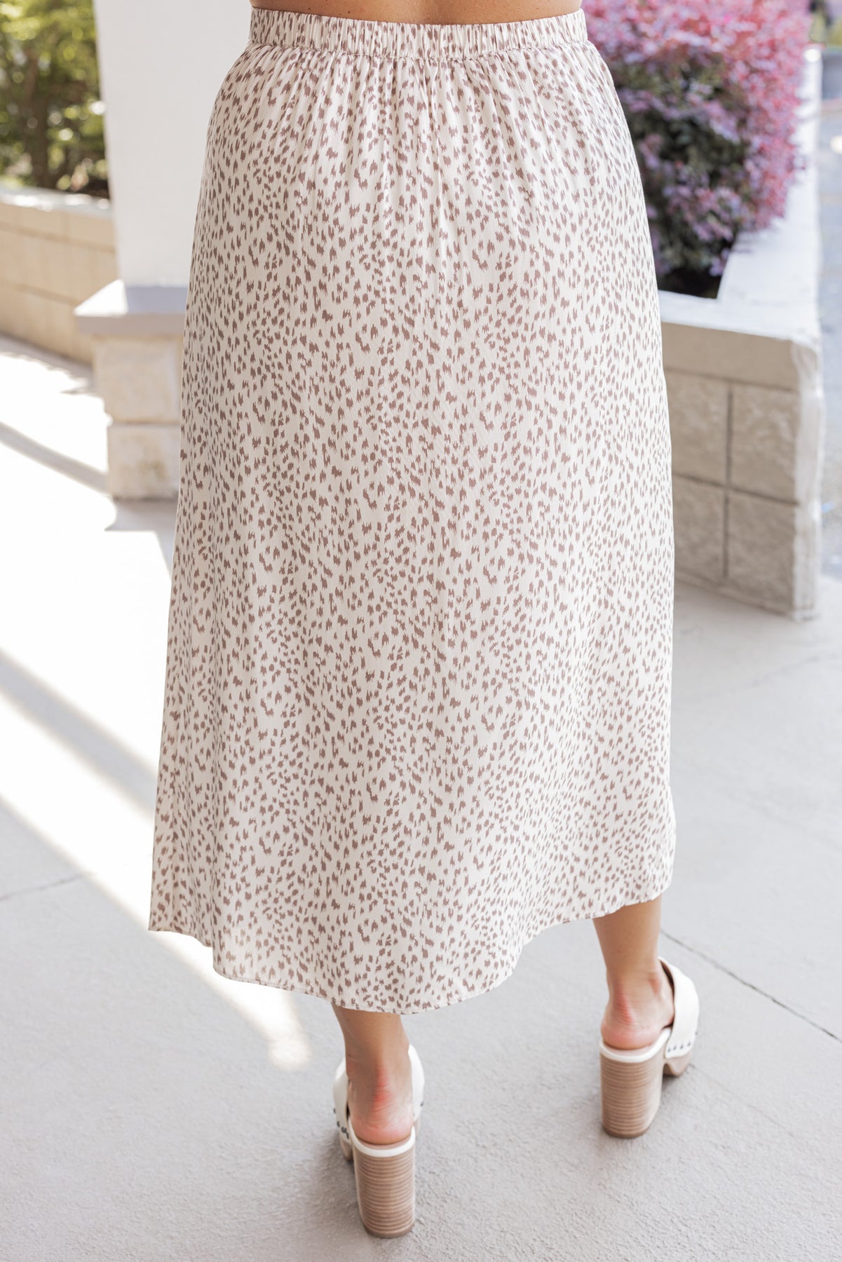 Cream and mocha animal print midi skirt by Wishlist showing skirts elastic waistband
