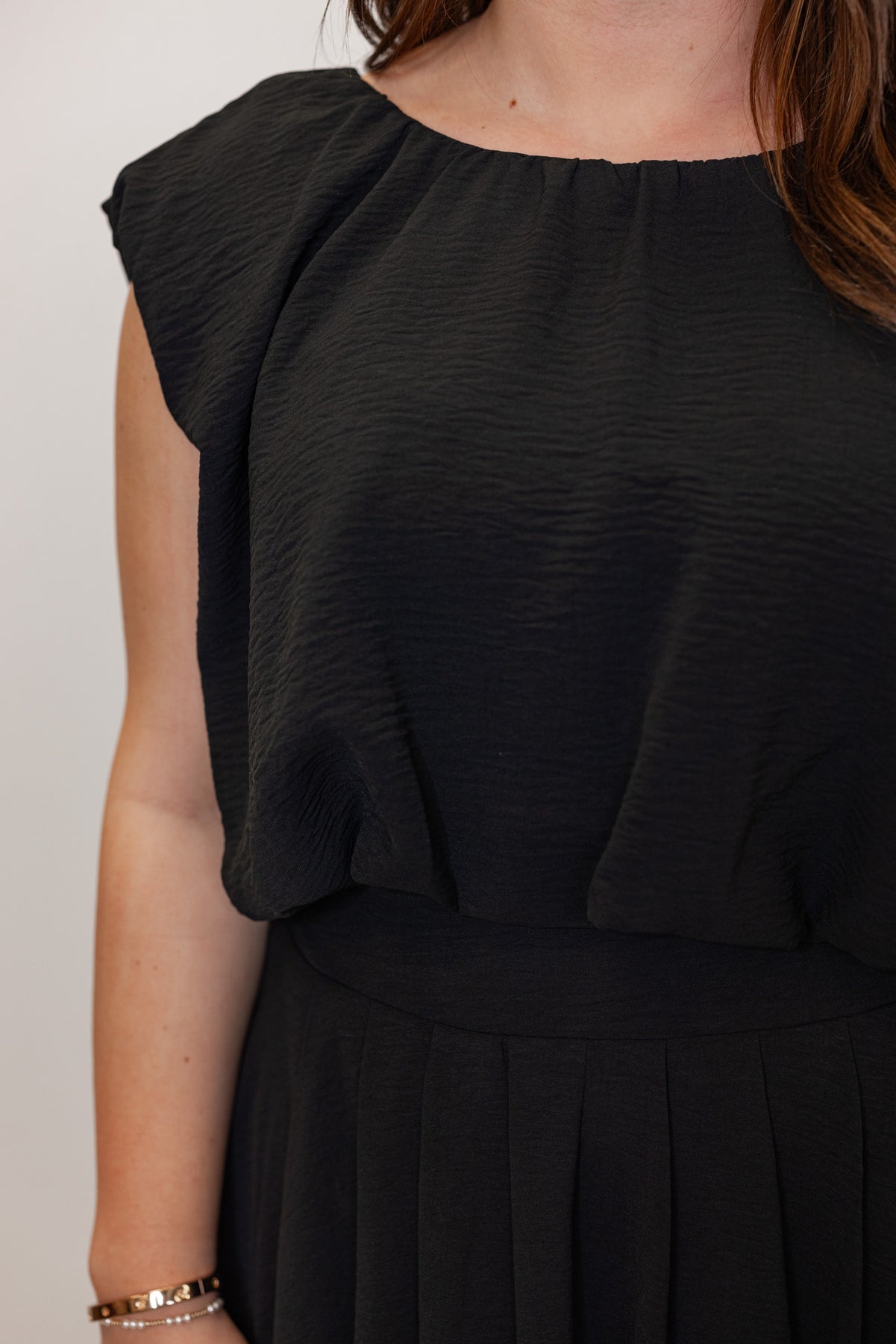 Get ready for Dreamy Summer Nights with this sassy bubble hem top! Featuring a crew neckline with an open tie back, in textured black fabric. The sleeveless style and trendy bubble hem add a flirty twist to this dreamy top. Pair with our matching skirt for the perfect outfit!