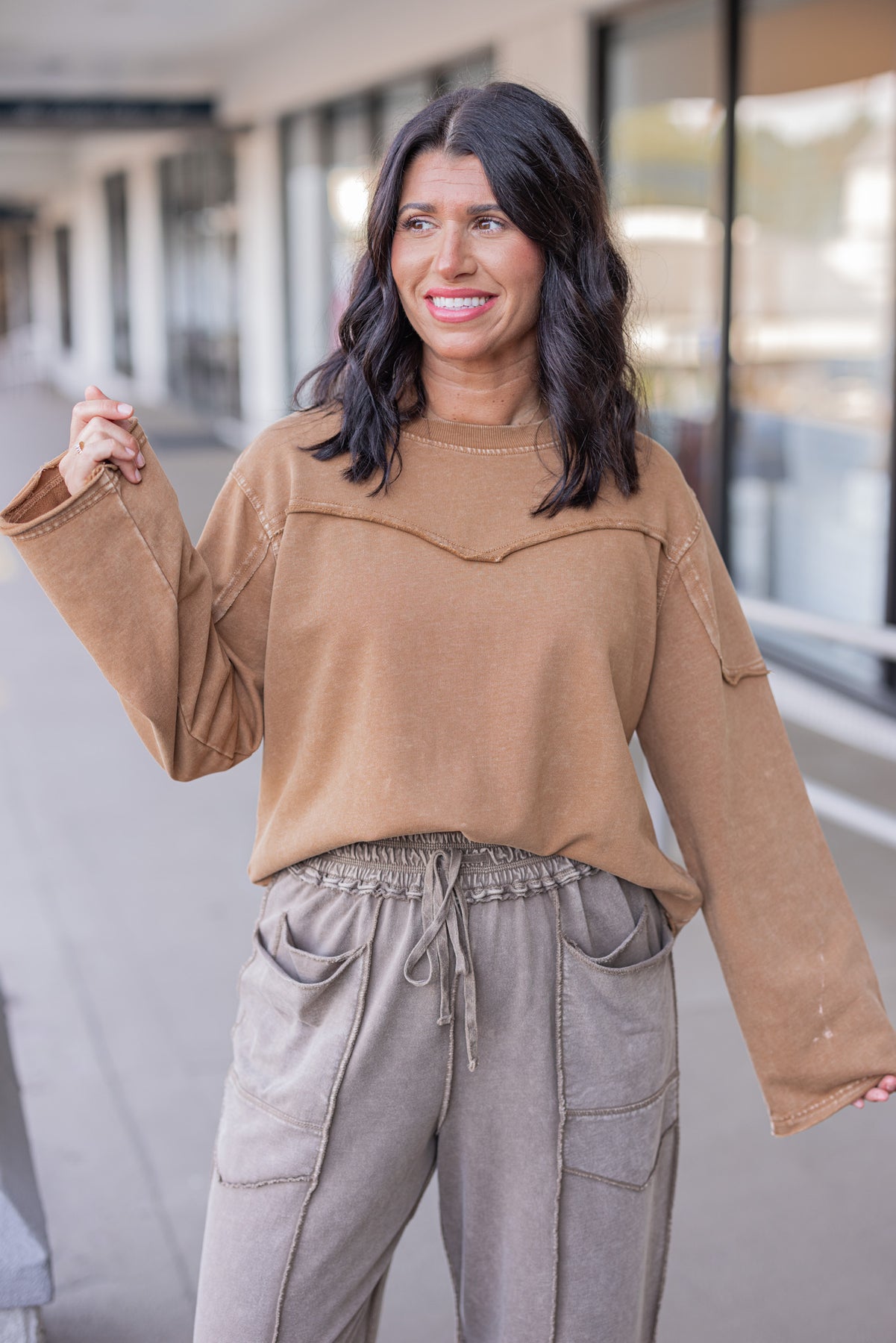 Cozy meets cool in this Casual Commitment Washed Caramel Pullover! Crafted from mineral washed caramel French terry knit fabric, it feels like your favorite soft sweater. The crew neckline and slightly flared sleeves add a fun twist, while the raw and reverse seam details give this pullover a laid-back, effortlessly stylish vibe. Perfect for lounging or casual outings, it’s your new go-to for comfort with a little edge! Shop the look: Pants | Sneakers