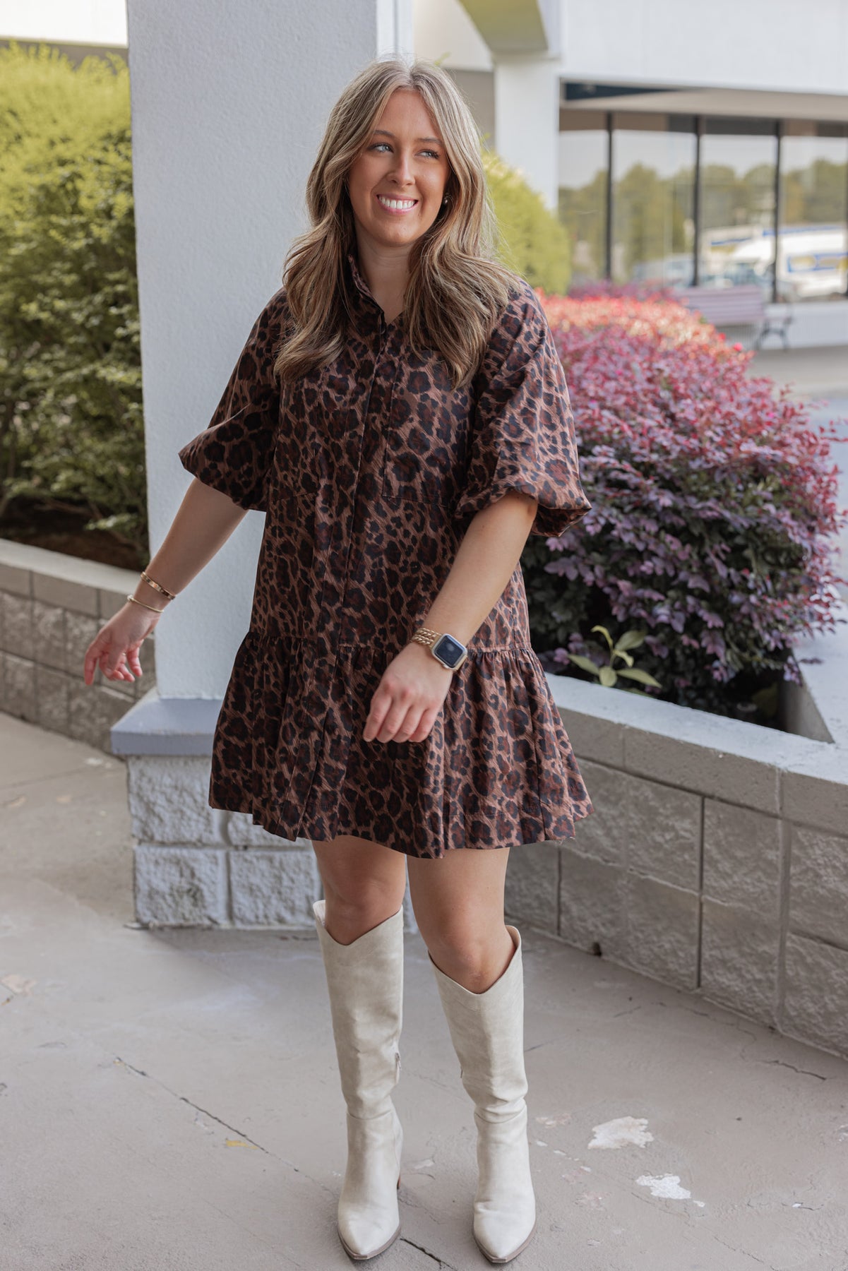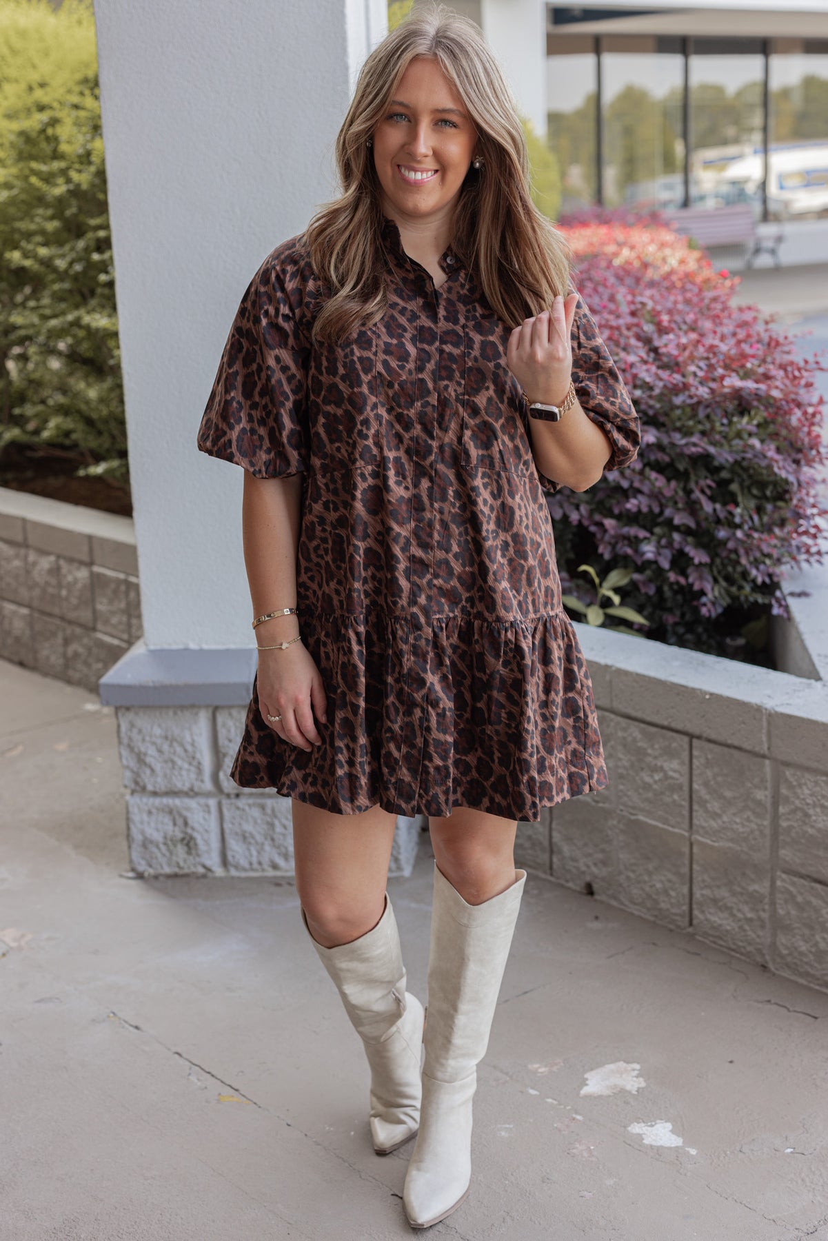 Stay trendy and stylish in the Karlie Leopard Print Ana Pocket Dress! This brown and black leopard print dress features a flap covered button front closure with a collar, short puff sleeves, pockets, and a ruffled bottom hem. The perfect little dress to show off your wild side!