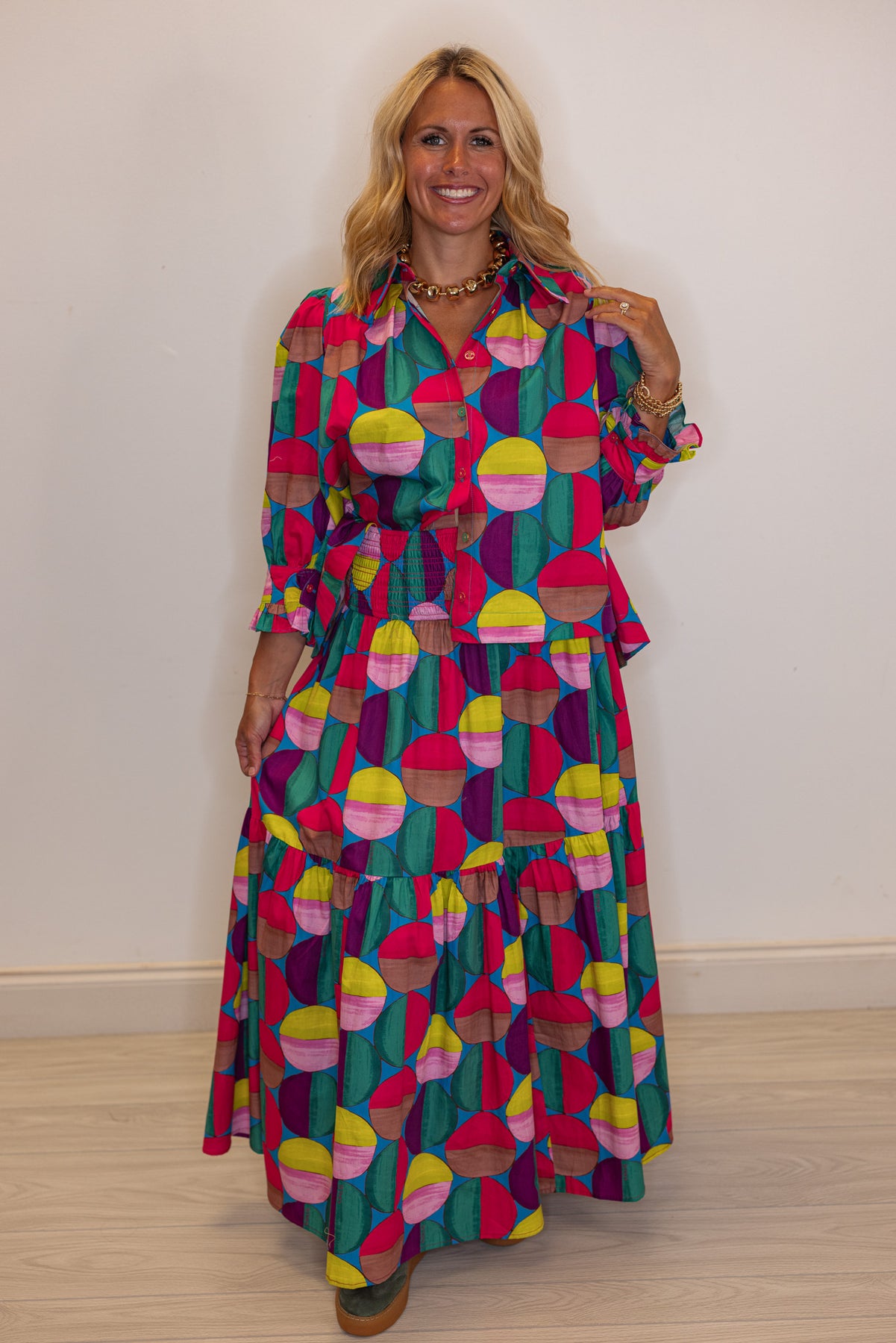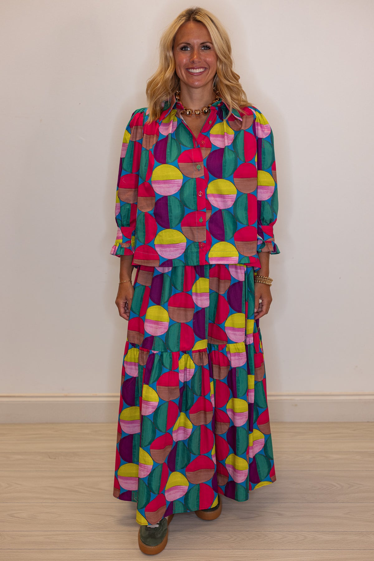This playful multicolor top pops with pinks, greens, yellows, teal, eggplant, and tan for a super fun outfit! Featuring a button front closure with colorful enamel buttons, a collar, and ruffle cuffed 3/4 length balloon sleeves for a flirty vibe. Perfect for sunny days and casual outings. Shop the matching SKIRT here!