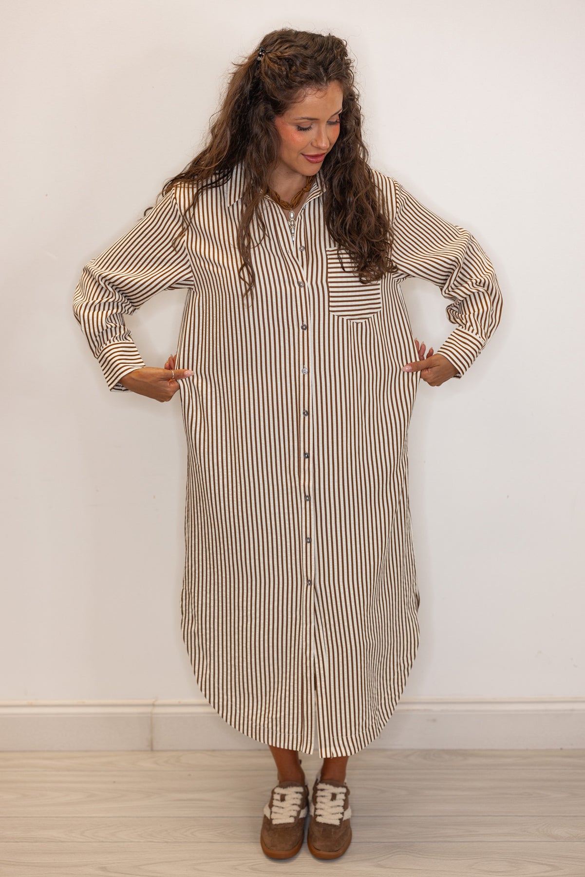 Embrace effortless style in the Striped Emotions Caramel Midi Dress! This playful ivory dress features caramel stripes and a classic button down front with a collar. The long sleeves and chest pocket with contrasting striped details add a quirky twist, making it perfect for casual days when you want a dash of fun and flair!