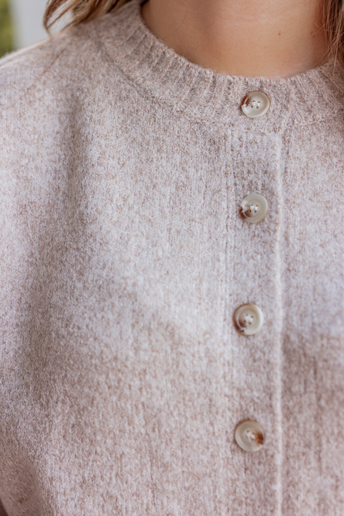 Jump on the cozy trend with this adorable knit top! Featuring brushed knit fabric in mocha, with a button front closure, and comfy 1/2 length sleeves. The ideal top for the upcoming seasons, whether worn casually with sneakers or dressed up with a skirt and boots - perfect buttoned up, or left open as a layering piece! Shop the look: Leopard Wide Leg Jeans