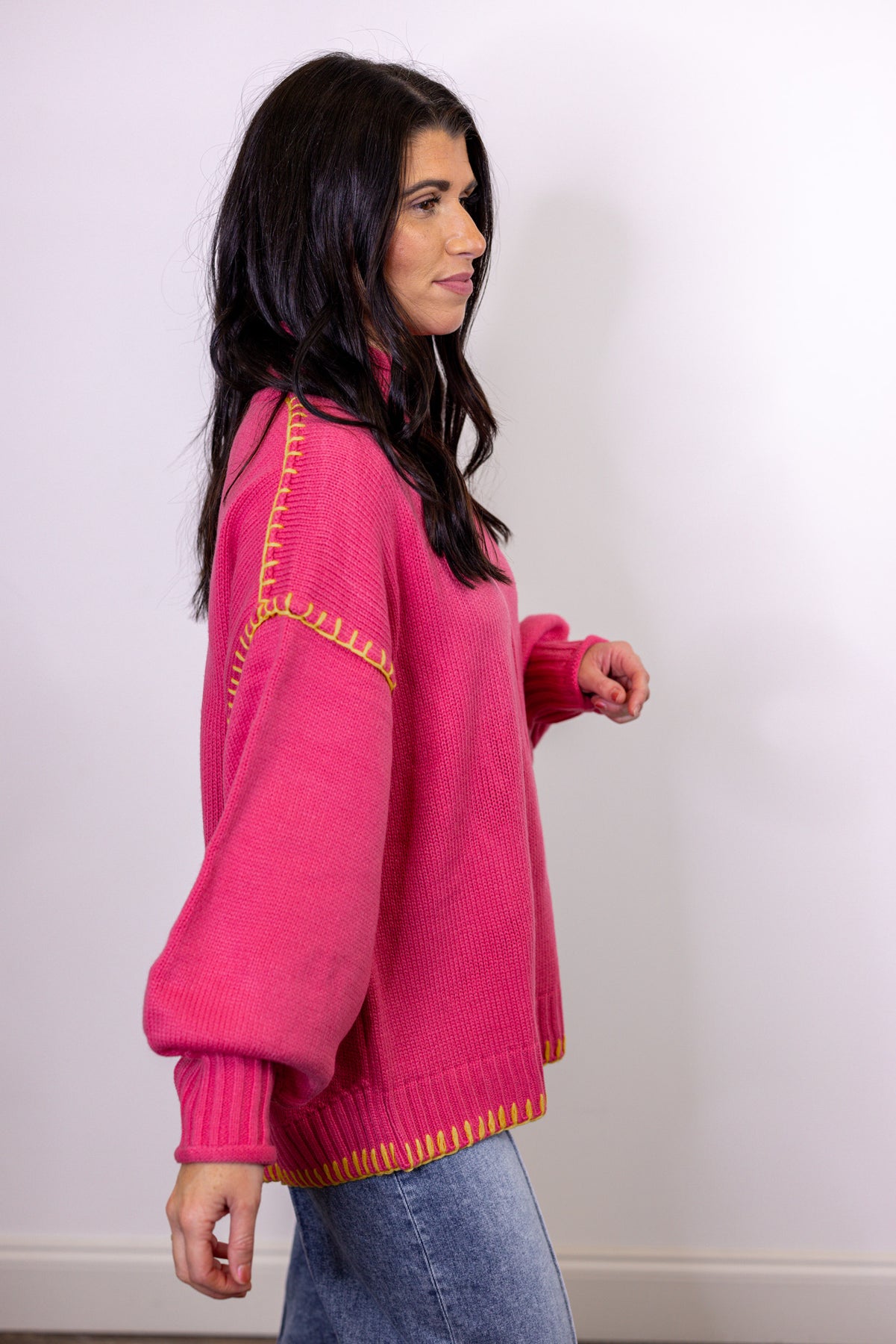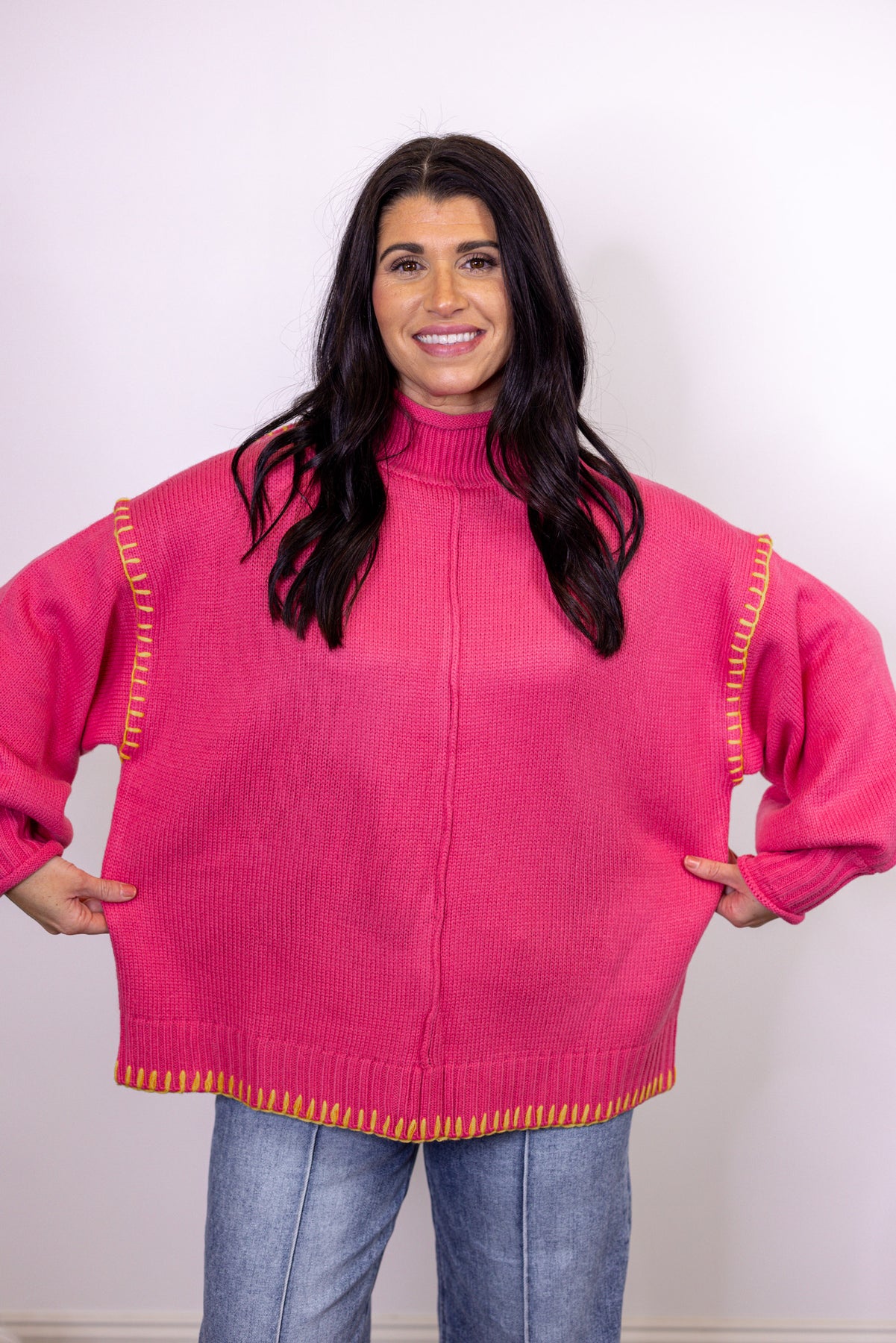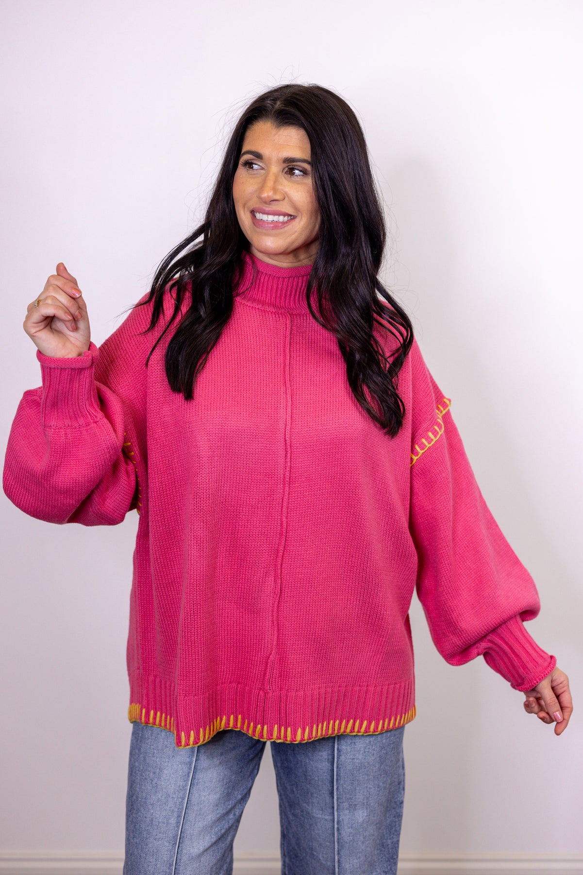 We are In Stitches and head over heels for this sweet sweater! Crafted with pink knit, and accented with playful mustard stitching, this babe features a mock neck, long balloon sleeves, and a slit in back of the bottom hem.