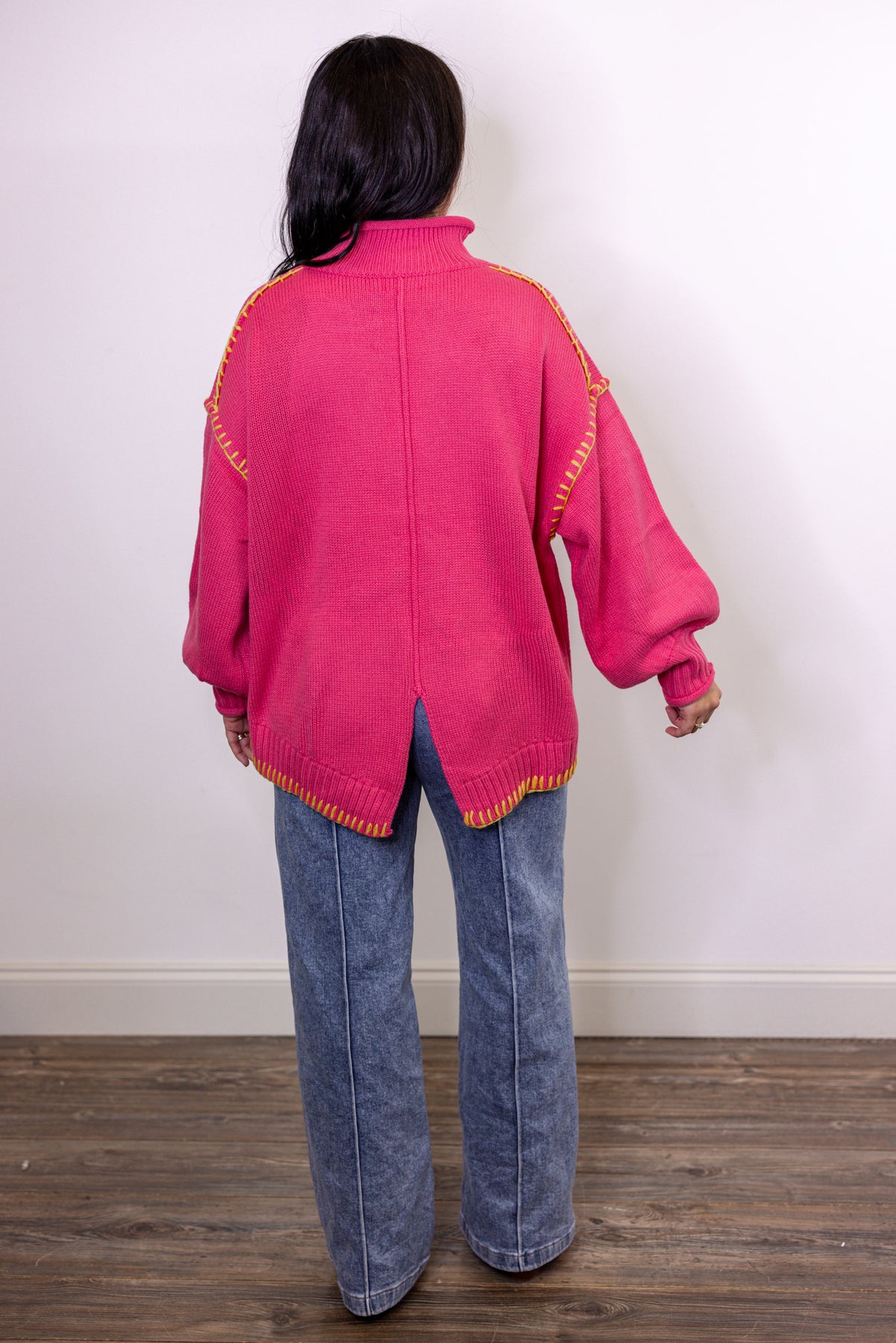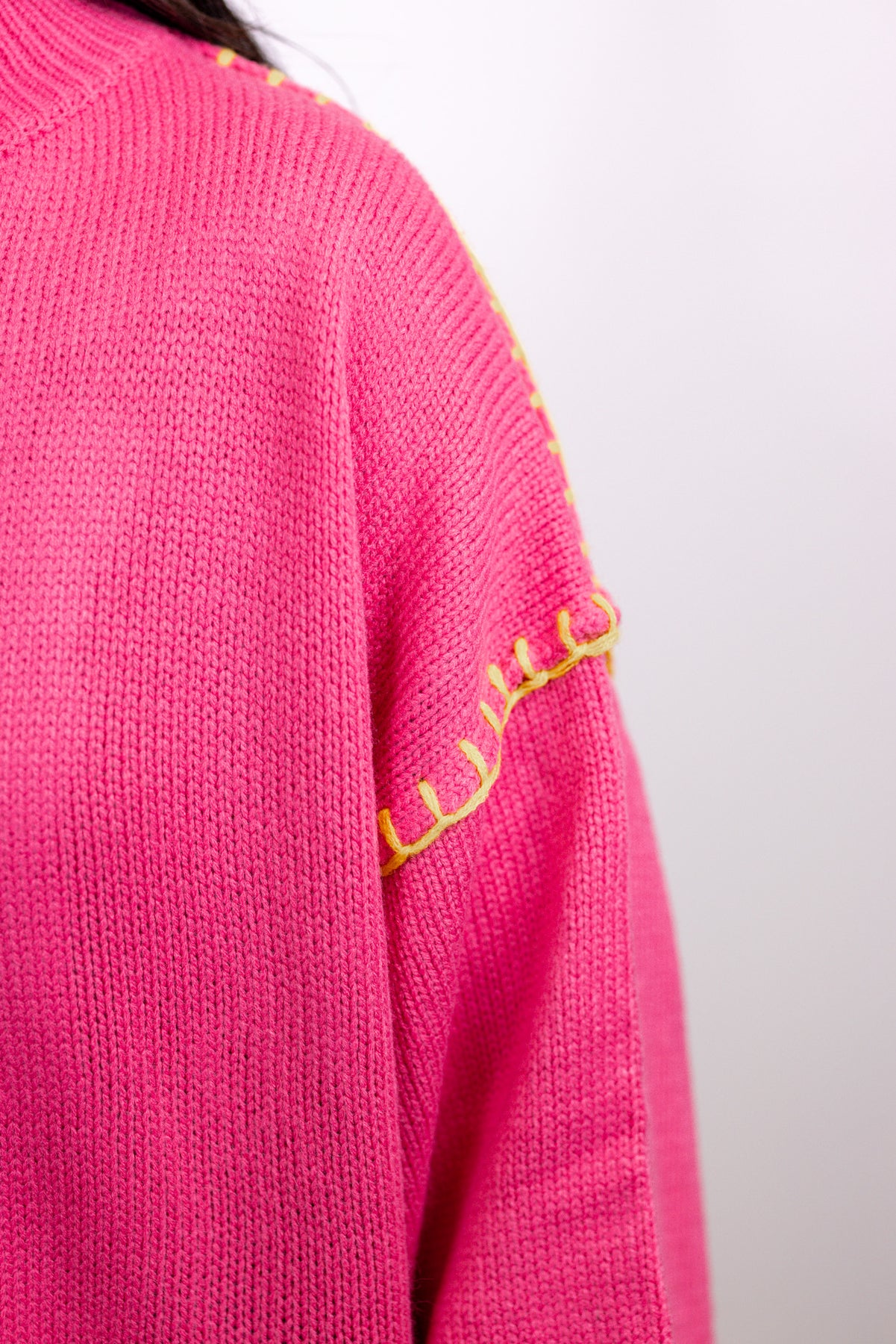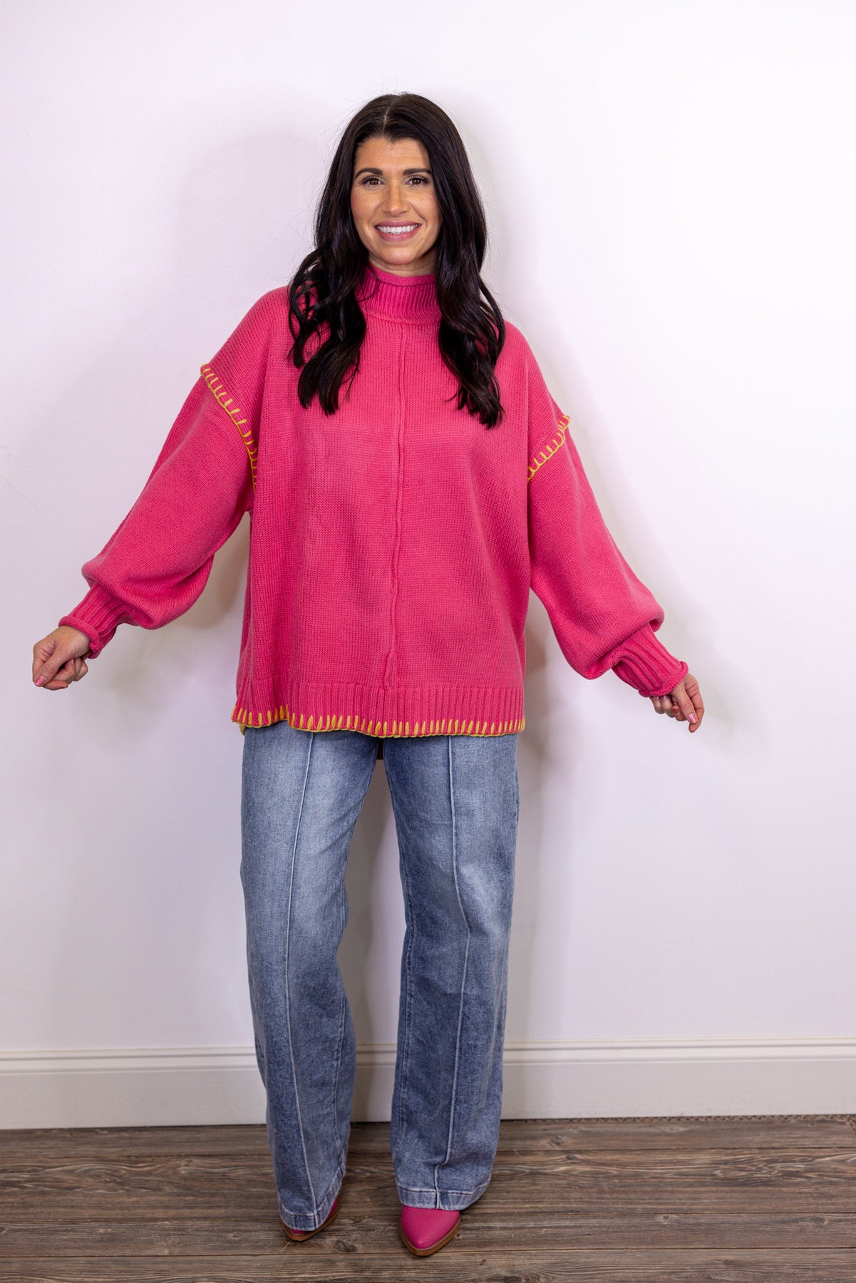 We are In Stitches and head over heels for this sweet sweater! Crafted with pink knit, and accented with playful mustard stitching, this babe features a mock neck, long balloon sleeves, and a slit in back of the bottom hem.