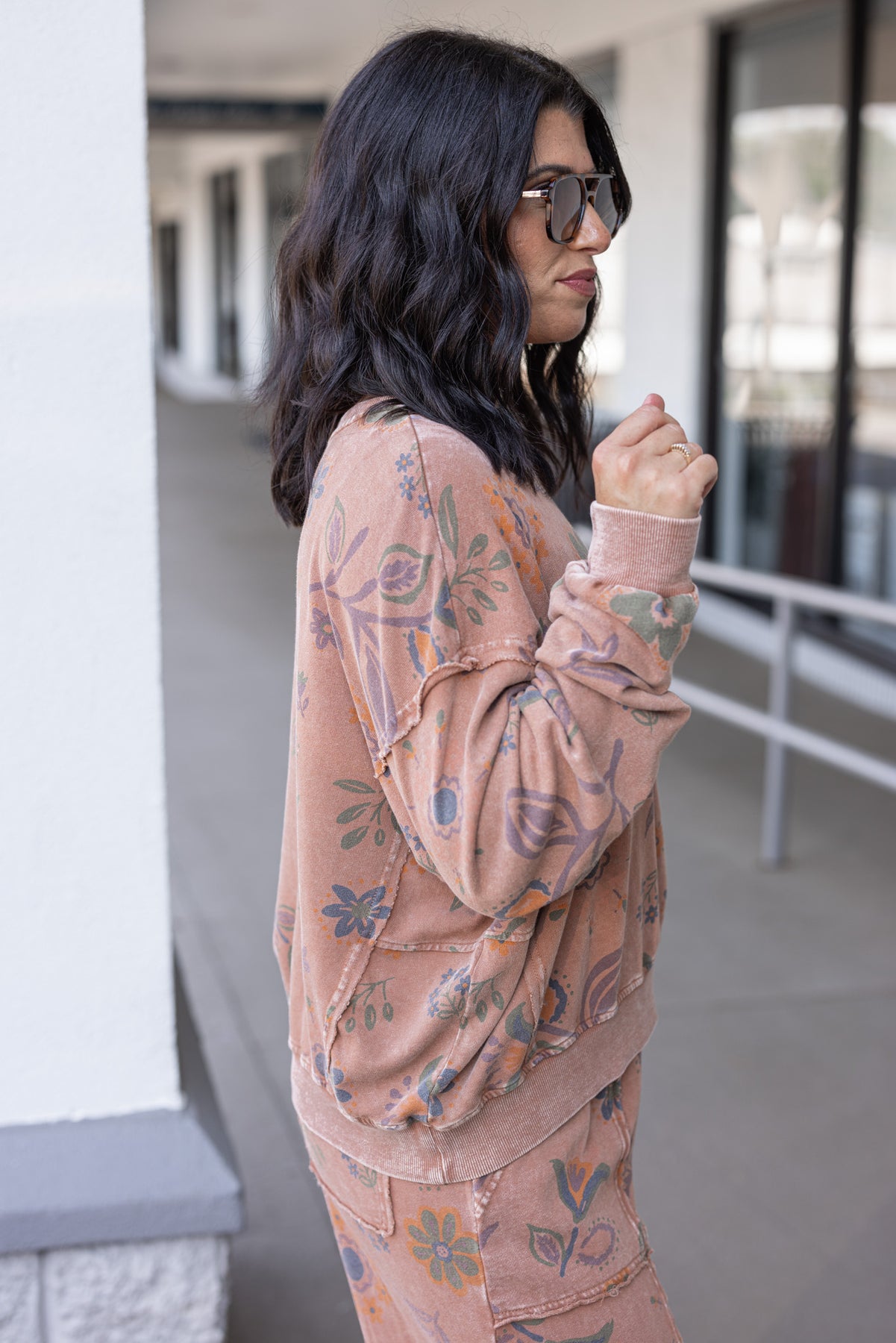 Add a splash of vintage charm to your wardrobe with the Vintage Dreams Mocha Floral Pullover! Featuring a whimsical floral print in muted tones of olive, purple and mustard. This cozy pullover’s crew neckline and long dolman sleeves make it perfect for laid-back days filled with style and comfort. Grab the matching pants here and embrace a playful outfit that feels like a daydream come true!